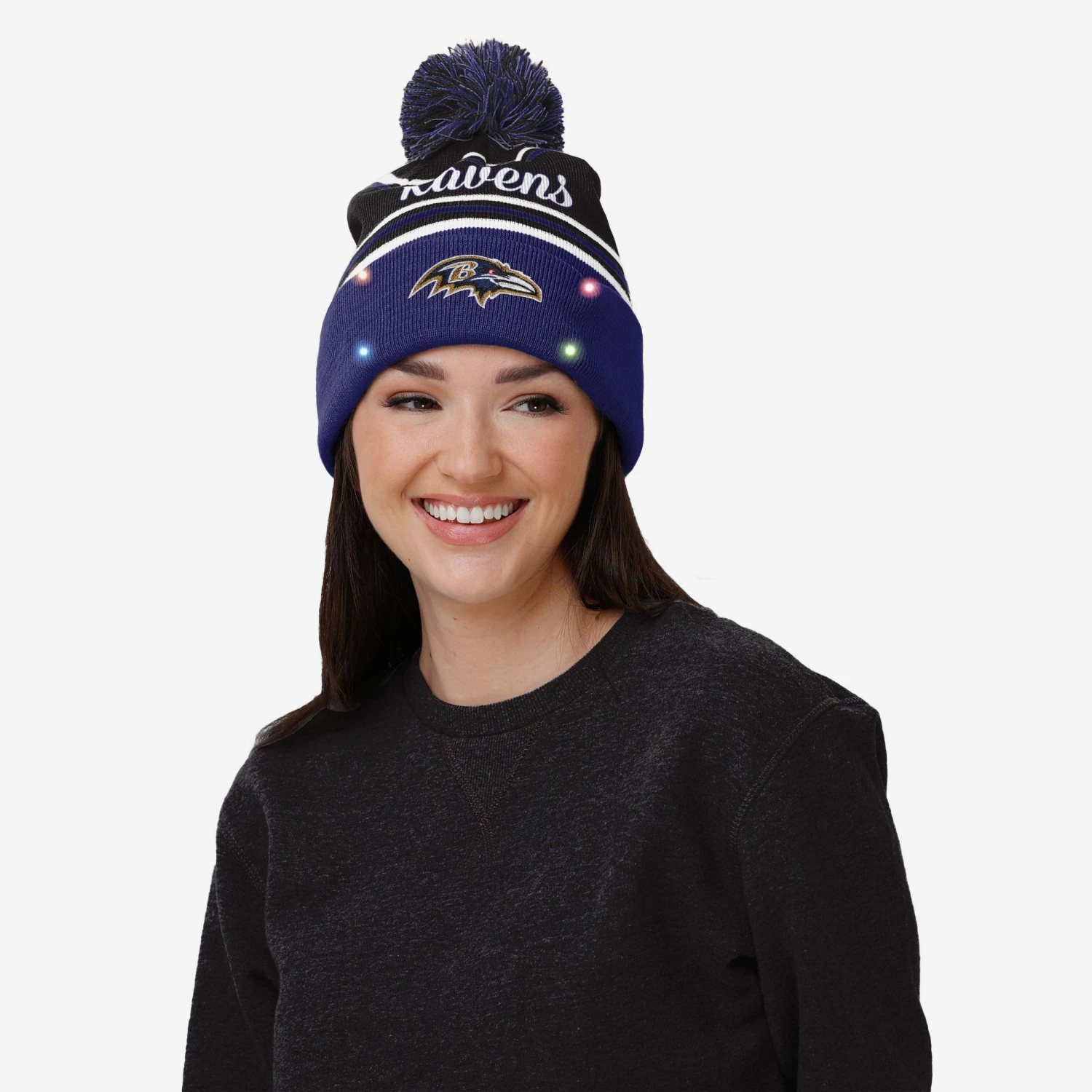 Turn that snow day into a glow day. The weather outside may be frightful, but wearing this Baltimore Ravens Women’s Wordmark Script Light Up Beanie is truly delightful.