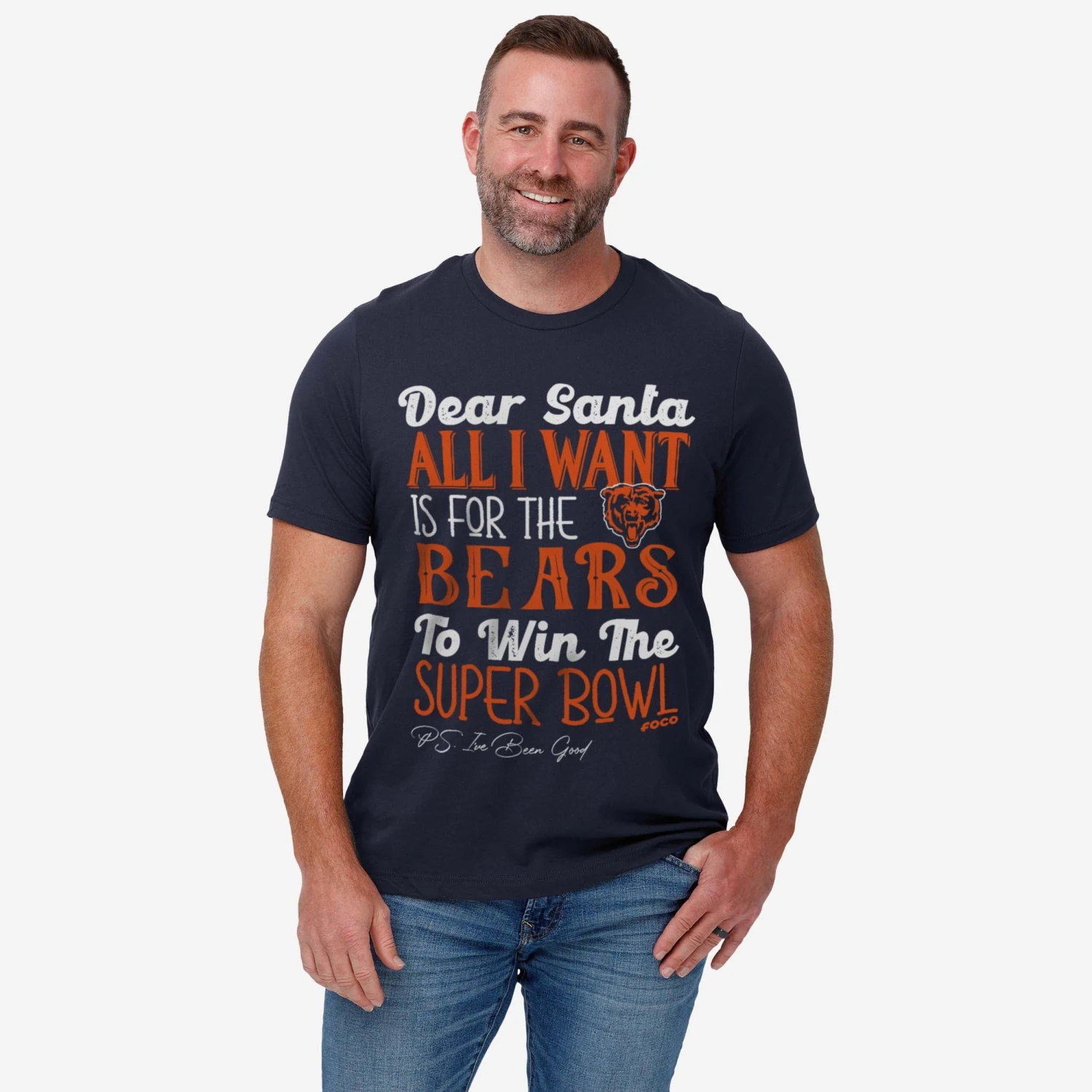 - Festive, team-colored design: This traditional t-shirt shows off the official Chicago Bears colors in an all-over design with festive font, so you can combine your team spirit with holiday spirit.